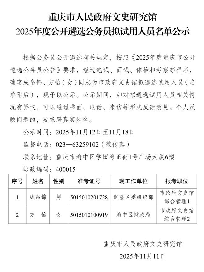 重慶市人民政府文史研究館2025年度公開遴選公務(wù)員擬試用人員名單公示